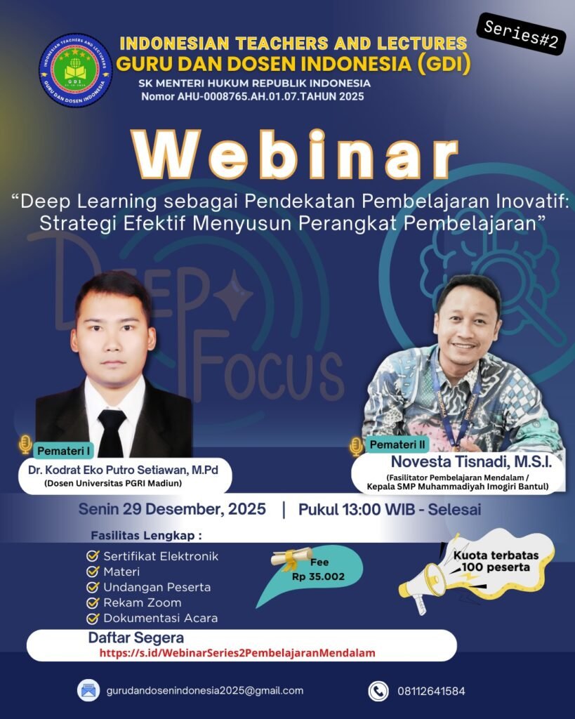 Perkumpulan Guru dan Dosen Indonesia (GDI) kembali menyelenggarakan kegiatan pengembangan profesional melalui Webinar Series #2 yang mengangkat tema “Deep Learning sebagai Pendekatan Pembelajaran Inovatif: Strategi Efektif Menyusun Perangkat Pembelajaran”. Kegiatan ini dilaksanakan secara daring pada Senin, 29 Desember 2025 dan diikuti oleh guru, dosen, serta praktisi pendidikan dari berbagai daerah di Indonesia.
